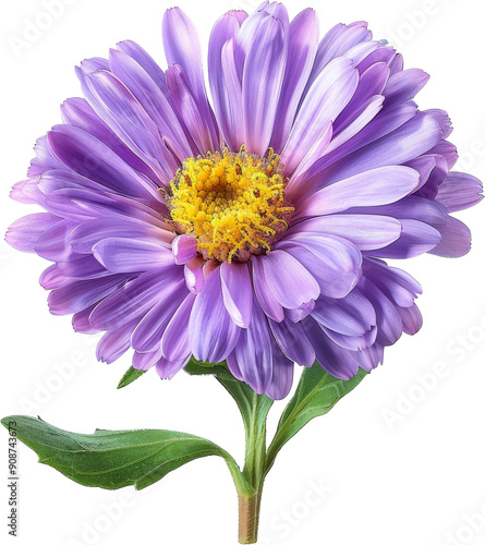 Close-up of a beautiful purple daisy with vibrant yellow center, showcasing detailed petals and green leaves against a white background.