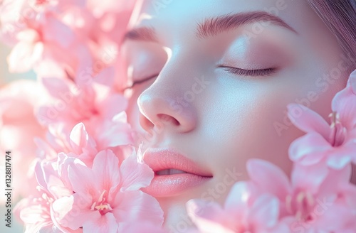 Close-up of a beautiful woman's face with closed eyes and pink flowers in her hand