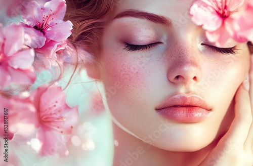 Close-up of a beautiful woman's face with closed eyes and pink flowers in her hand
