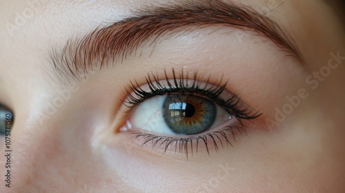 Close-up of a Beautiful Young Woman’s Eye with Striking Green and Brown Irises, Long Lashes, and Smooth Skin Illuminated by Soft Natural Light