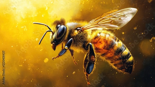 Close-up of a bee in flight against a golden background, showcasing its detailed anatomy and wings
