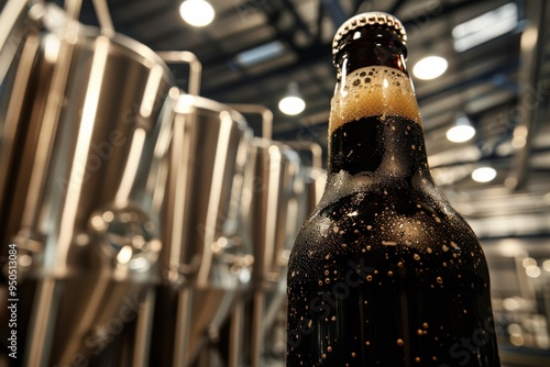 beer, bottle, brewery, closeup, chilled, condensation, brewing, industry, production, factory, stainless steel, equipment, amber, cold, fresh, beverage, alcohol, drink, industrial, modern, sharpened, manufacturing, process, background, blurry, bottle cap, bottled, ales, lager, brew, hop, malt, fermentation, craft, artisan, cardboard box, assembly line, glasses, bottle