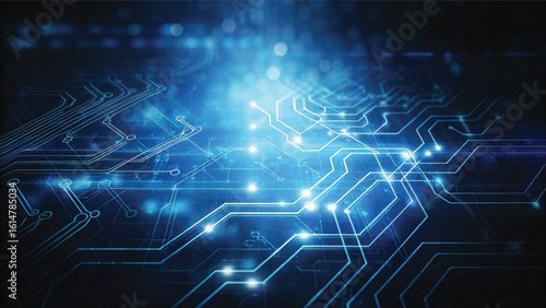 Close-up of a blue circuit board background with digital lines illustrating technology and network communication design