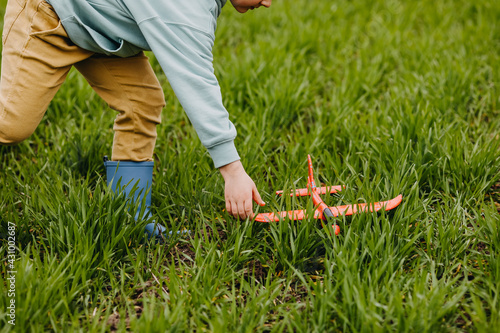 boy, holding, playing, closeup, plane, pilot, fly, red, toy, aeroplane, children, field, green, grass, freedom, countryside, spring, nature, outdoors, outside, meadow, children