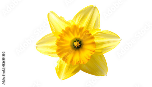 Close-up of a bright yellow daffodil flower with a detailed orange center, isolated on black