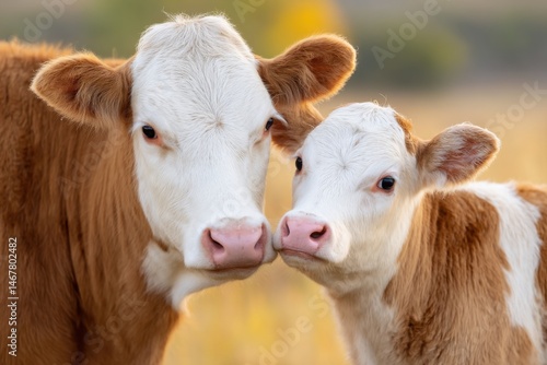 Close-up of a brown and white cow with its calf, showcasing their gentle expressions and bond in a serene rural setting, highlighting the beauty of farm life and animal companionship