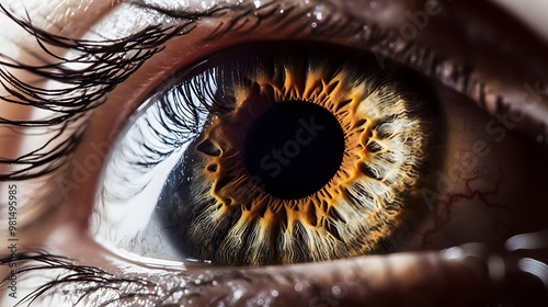 Close-up of a brown eye with long eyelashes.