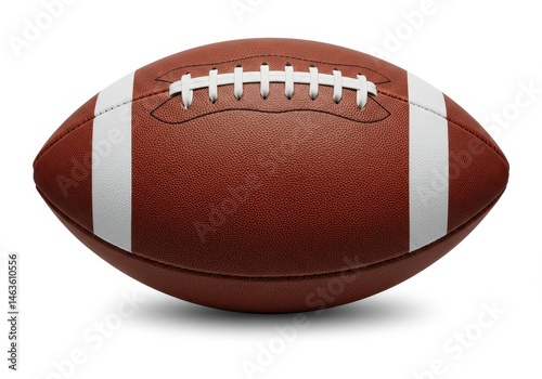 Close-up of a brown leather american football with white stripes and laces isolated on a white background