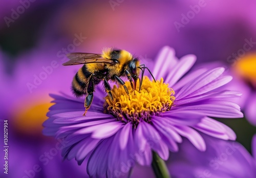 Close-up of a Bumblebee Pollinating Purple Flower in Vibrant Garden During Bright Daylight Capturing Nature's Beautiful Interaction and Colorful Details