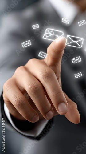 Close-up of a businessman pointing at bright email icons, showcasing digital marketing and communication in a professional environment