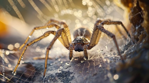 Close-up of a cave spider, intricate web glistening with morning dew drops.