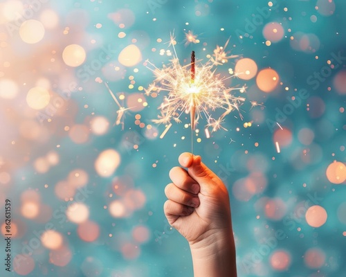 Close-up of a child's hand holding a bright sparkler against a bokeh-filled background, evoking celebration, joy, and festive atmosphere.