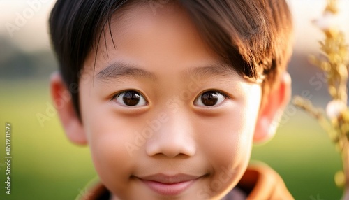 Close-up of a child's innocent brown eyes, sparkling with wonder, set against a blurred, sun