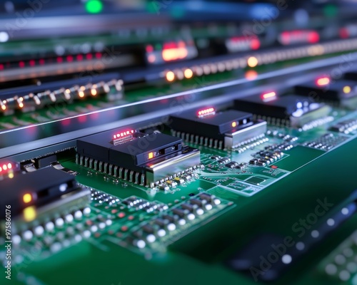 circuit board, microchip, semiconductor, electronic, technology, digital, hardware, computer, server, datum, processing, information, network, cyberspace, communication, innovation, future, progress, modern, abstract, background, green, metal, light, closeup, detail, macro, futuristic, high technology, industrial, manufacturing, design, engineering, science, research, development, chips, integrated circuit, electronic device, motherboard, central processing unit, memory, storage, power, signal, power supply