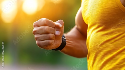 Close-up of a clenched fist of an athlete in a yellow t-shirt during an intense workout or run. Generative AI