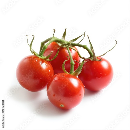 Close-up of a cluster of ripe, red cherry tomatoes on stems, against a white background