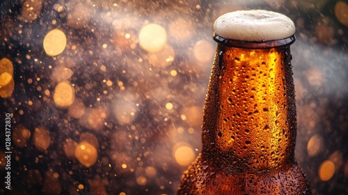 Close-up of a cold beer bottle, condensation, bokeh lights, rain