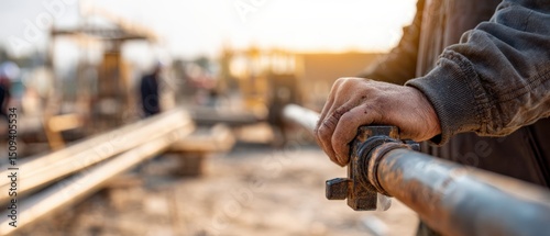 Closeup of a construction workers hand gripping scaffolding pipe on a sunny construction site, showcasing manual labor and industrial safety