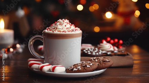 Closeup of a cozy floating caf? serving steaming hot cocoa, decorated with candy cane straws, whipped cream, and gingerbread cookies, perfect for warming up on a chilly Christmas day.