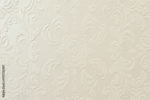 Close-up of a cream-colored embossed wallpaper with intricate floral patterns and designs.