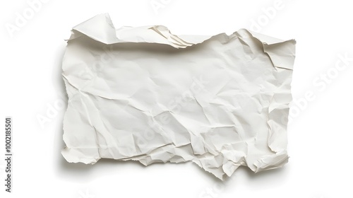 Closeup of a crumpled torn sheet of plain white paper isolated on a clean plain white background This textured distressed paper surface can be used for abstract graphic design elements