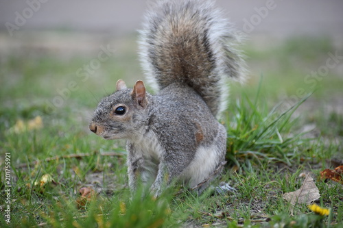 Closeup of a cute squirrel sitting in a park on a green meadow in Washington on a sunny spring day