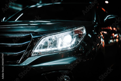 Close-up of a dark SUV's headlights at night