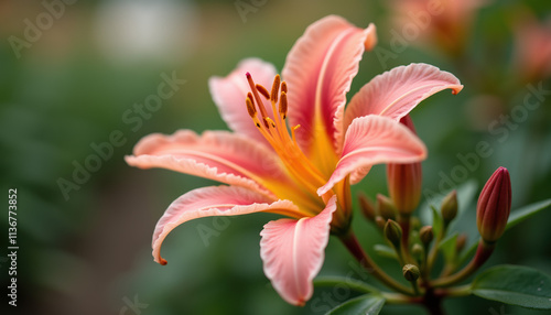 Close-up of a delicate pink lily flower blooming in a garden.