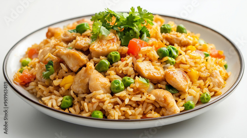 Close-up of a delicious, colorful chicken fried rice dish with vibrant vegetables and fresh cilantro, served on a white plate.