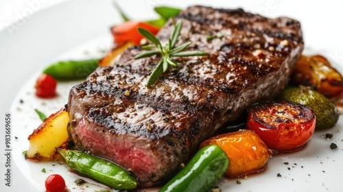 Close-up of a delicious halal steak with roasted vegetables, plated on a clean white surface.