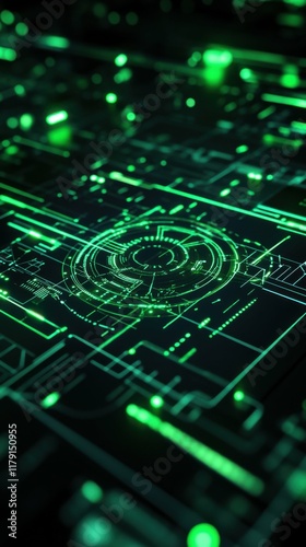 Close-up of a digital holographic interface glowing with green elements, futuristic and eco-friendly depiction, isolated with a dark gradient background for focus.