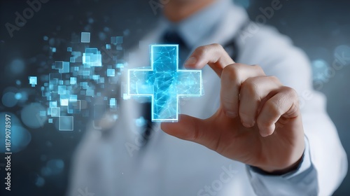 Close-up of a doctor holding a floating medical cross icon in a laboratory. Concept: Medical research and technology, diagnosis and symptom analysis, professional healthcare, remedial-clinical care.