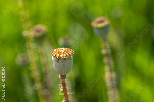 Close-up of a dried poppy seed pod with green blurred background. Macro botanical nature photography, simple and natural