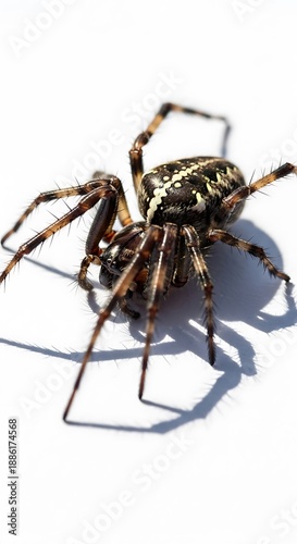 Close-up of a European garden spider on a white surface.