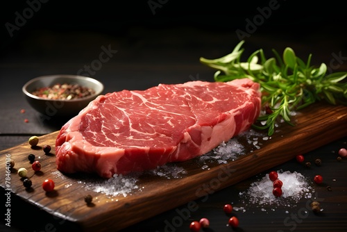 Close-up of a fresh piece of beef meat, steak with herbs and spices on a wooden board on a dark background, generated by AI