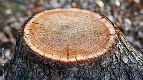 Closeup of a freshly cut tree stump showcasing natural wood texture and growth rings in a serene woodland setting