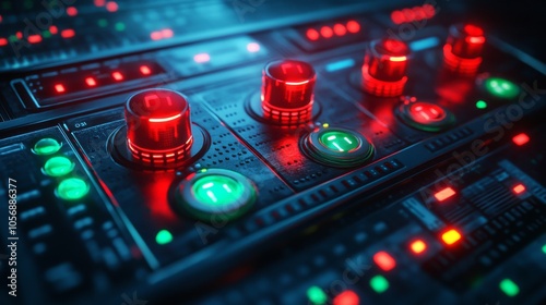 panel, control, futuristic, technology, interface, buttons, knob, red, green, light, illuminated, glowing, digital, electronic, circuit, board, system, modern, abstract, detail, macro, texture, design, industrial, concept, background, graphic, element, hardware, equipment, machine, contraption, device, computer, screen, display, indicator, power, on, off, signal, status, alarm, warning, alert, operation, worked