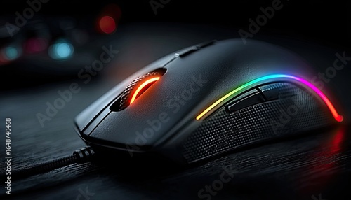 mouse, gaming, lighting, black, wired, technology, computer, hardware, ergonomic, design, focused, close, detail, illuminated, rainbow, bright, electronic, accessory, modern, tech, contraption, portable, precise, control, fast, speed, responsive, accurate, professional, performance, adjustable, buttons, scroll, wheel, comfort, hard-wearing, quality, device, usb, cable, dark, background, table, wooden, surface, electronic, input