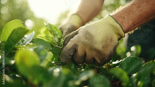 Close-up of a gardener's gloved hands gently pruning a vibrant plant, symbolizing cultivation, care, and the serene art of gardening in natural sunlight.