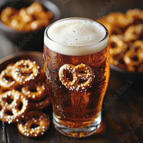 Close-up of a Glass of Beer with Pretzels