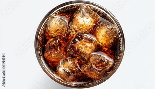 soda, drink, ice, cold, glasses, refreshment, fizzy, carbonated, beverage, sweet, sugary, cool, top, view, transparent, round, cube, dark, brown, liquid, bubble, image, studio, food, delicious, carbonation, refreshing, sweetened, chilled, iced, cold drink