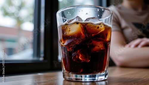Closeup of a Glass of Ice-Cold Carbonated Beverage with Ice Cubes on a Wooden Table at a Café