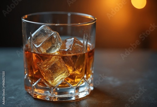 Close-up of a glass with whiskey and ice cubes on an aesthetic background, copy space on a side