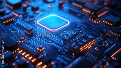 Close-up of a glowing blue Central Processing Unit (CPU) on a circuit board. High tech digital technology background, showing intricate details of computer hardware.