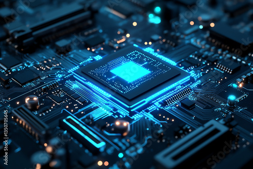 Close-up of a glowing microchip on circuit board, blue light