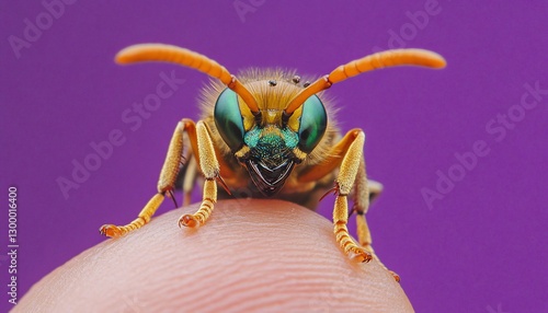 Close-up of a gold and green wasp perched on a finger against a purple background.