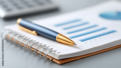 Close-Up of a Gold-Ballpoint Pen on a Notebook with Financial Graphs and a Calculator in the Background for Business and Finance Themes