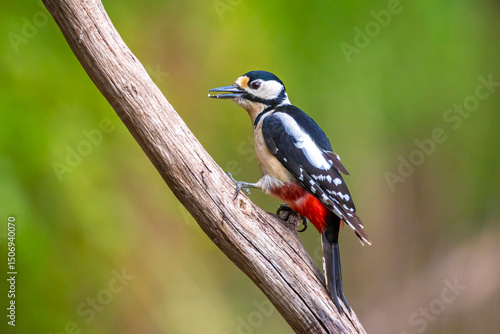 Closeup of a great spotted woodpecker, Dendrocopos major, perched in a forest