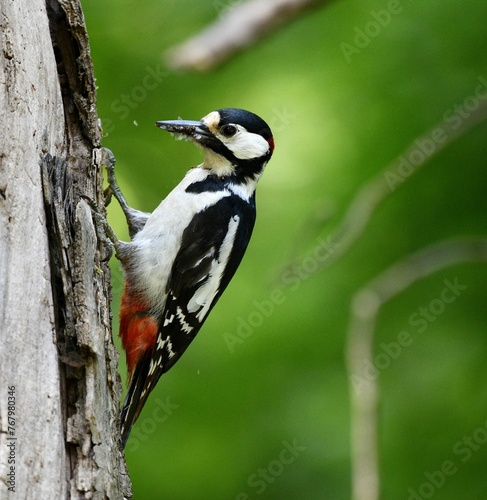 Closeup of a Great spotted woodpecker on the tree with a blurred background