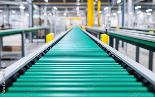 Close-up of a green conveyor belt in a modern industrial setting, conveying items in an efficient workspace.